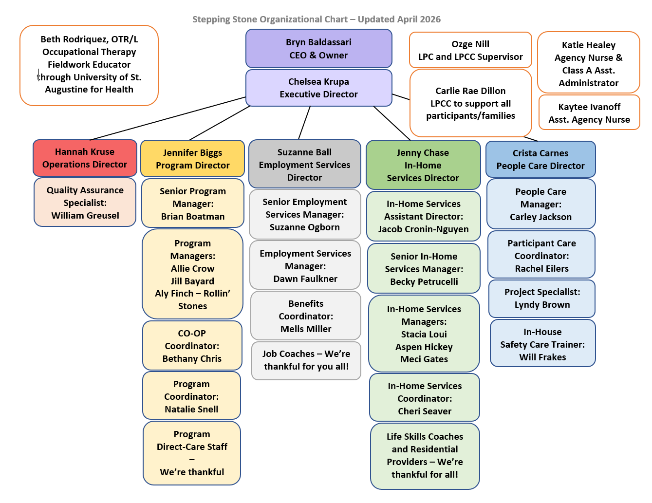 Chelsea graduated from Metropolitan State University of Denver with a degree in behavioral science and sociology. Following graduation, she began supporting the IDD community as a direct support professional. Over the last 14 years, she has served this population as SLS Provider, Day Program Manager, Behavioral Services Manager, Employment Services Director, and she started the Residential program at Stepping Stone in 2016. Chelsea now oversees services and operations at Stepping Stone as Executive Director. A Colorado native, she enjoys camping and the outdoors with her husband, daughter, and dog. She loves being part of the Stepping Stone team and looks forward to continuing the growth of innovative service opportunities for the individuals we support.