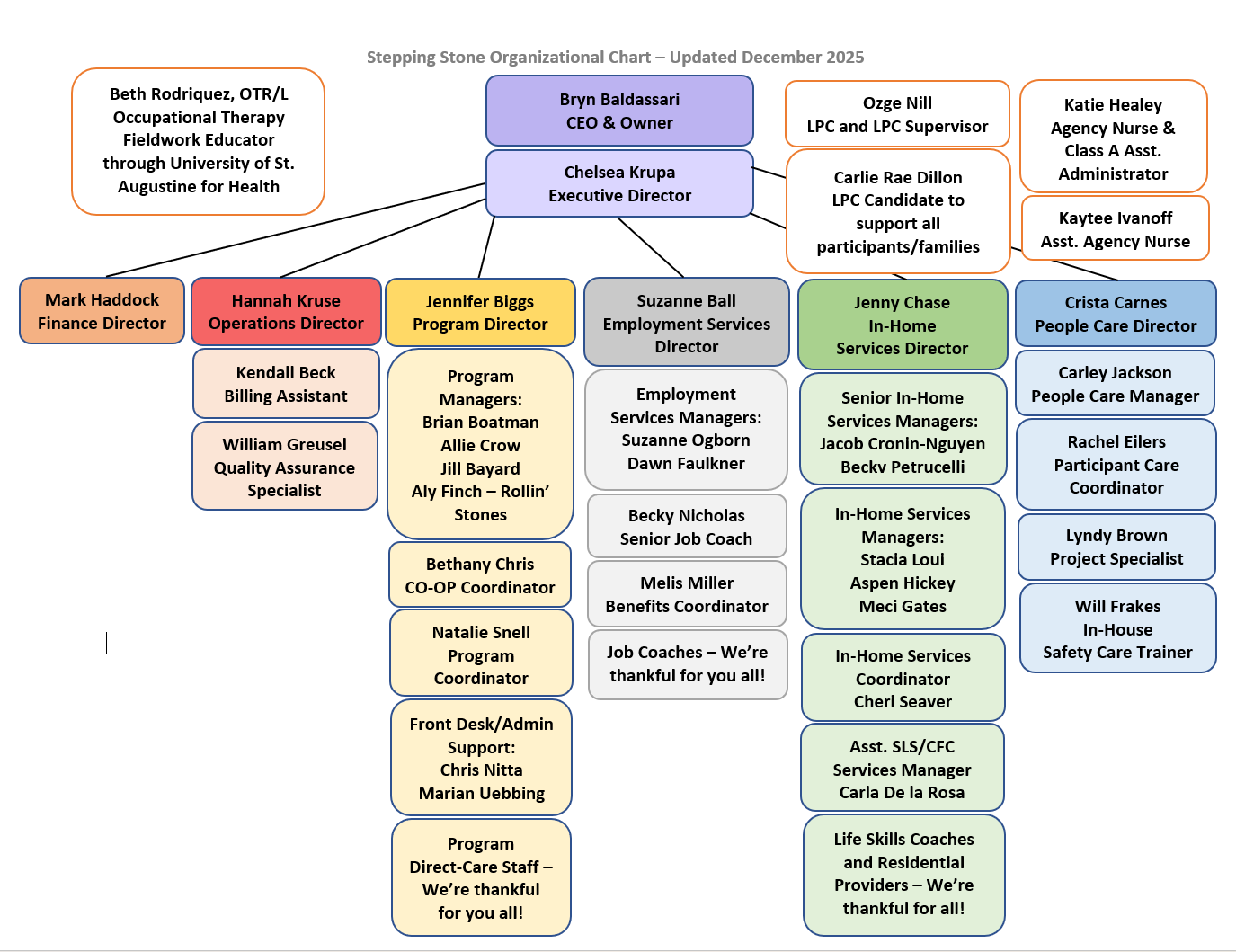 Chelsea graduated from Metropolitan State University of Denver with a degree in behavioral science and sociology. Following graduation, she began supporting the IDD community as a direct support professional. Over the last 14 years, she has served this population as SLS Provider, Day Program Manager, Behavioral Services Manager, Employment Services Director, and she started the Residential program at Stepping Stone in 2016. Chelsea now oversees services and operations at Stepping Stone as Executive Director. A Colorado native, she enjoys camping and the outdoors with her husband, daughter, and dog. She loves being part of the Stepping Stone team and looks forward to continuing the growth of innovative service opportunities for the individuals we support. -